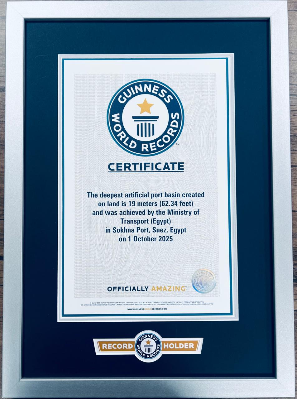 في إنجاز عالمي للموانيء المصرية يعكس حجم التطور الكبير الذي تشهده واستمرار لسلسة الانجازات التي تحققها الموانئ المصرية في مختلف التصنيفات العالمية تسلم الفريق مهندس كامل الوزير نائب رئيس مجلس الوزراء للتنمية الصناعية وزير الصناعة والنقل خلال زيارته لميناء السخنة من السيدة كانزي الدفراوي المحكم المعتمد لجينيس للأرقام القياسية شهادة موسوعة جينيس للأرقام القياسية لميناء السخنة كأعمق حوض ميناء من صنع الإنسان ، ينشأ على اليابسة بعمق 19 م